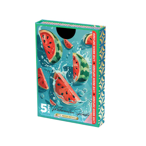 Get ready for an undeniably juicy experience with our Watermelon Splash 5-Pack Live Resin Infused Pre-Rolls. Bursting with bright, fruity flavors, these pre-rolls deliver an immediate face-splitting grin. As the sharp watermelon flavor envelops your palate, indulge in waves of candy-like heaven. Enjoy peaceful, relaxed effects with every puff, savoring the delightful blend of candy and melon. Perfect for those moments when you want to unwind and smile, Watermelon Splash promises a refreshing and delectable cannabis experience.